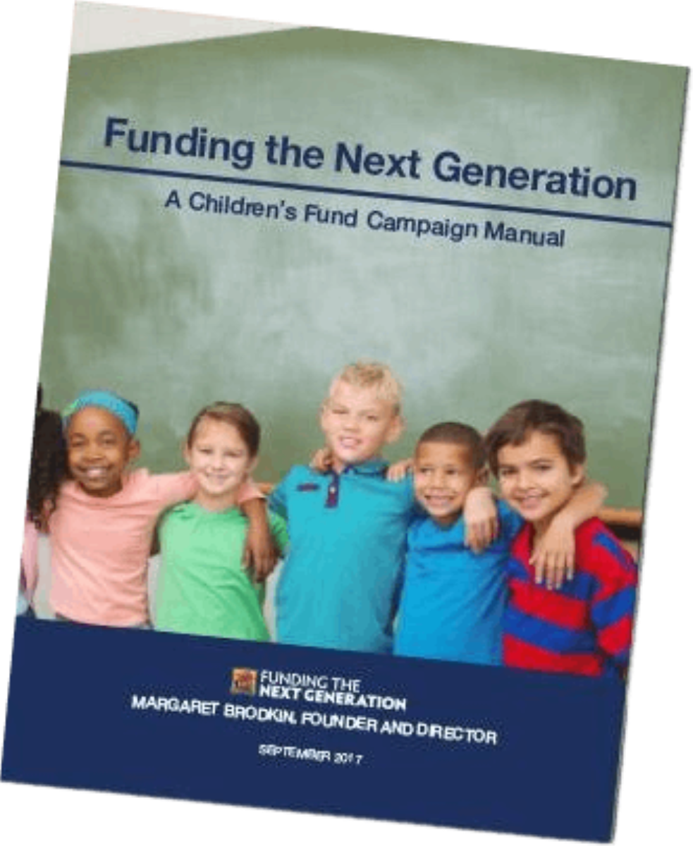 This manual starts where our other manual leaves off. It is a guide to creating a local children’s fund through the ballot - giving local voters the opportunity to directly allocate funds to children and youth services. It covers getting started, building your campaign, voter communication and how to put it all together. It is not intended as a substitute for professional consultation from lawyers and campaign consultants. Funding the Next Generation and our network of advocates, consultants and advisors are available to help you take the next steps on the road to a successful campaign.